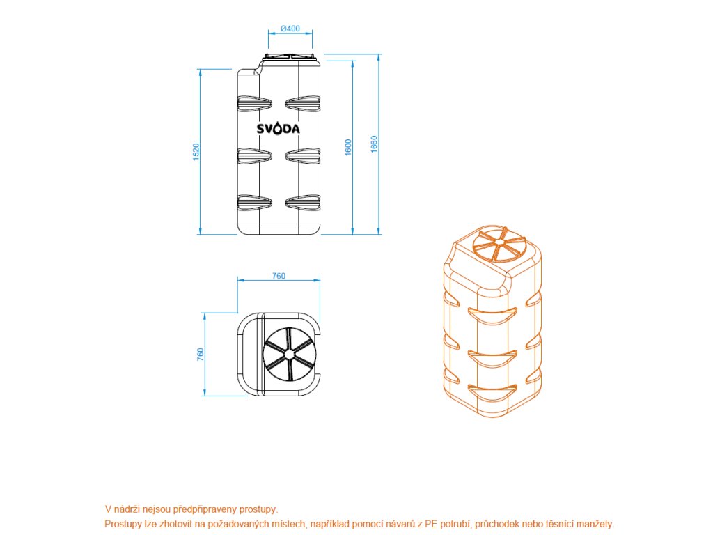 Nádrž je vyráběna technologií rotačního odlévání plastů (rotomoulding). Celá konstrukce je z jednoho kusu bez svárů, což zaručuje výbornou mechanickou odolnost a eliminuje riziko netěsností.